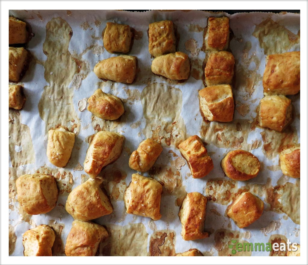 Originally, we tried these as whole pretzels but they were just too big for Emma and Katie. But pretzel bites were just the right size for their little hands plus they were perfect for dipping. We’ve also made them with and without dairy. Both were extremely successful. We’ve now made these on a few occasions and every time, they barely cool before we eat nearly all of them. Consider yourself warned!