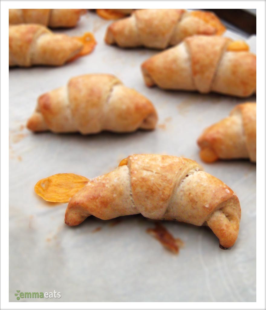 Divide the rested dough in two and roll each piece into a 10″-12″ round. Cut each round into 8 equal-sized triangles. Place a piece of cheese on the wide end of one of the triangles and roll the dough over top of it. Continue rolling the dough up until it forms a little crescent roll. Repeat with the remaining triangles until all 16 crescent rolls are formed. Place 8 rolls on each of the prepared baking sheets and let rest again for 15 minutes or so. Make sure the narrow point of the triangles are on the bottom of the roll so it won’t expand and start to slightly unravel while baking. They’ll have risen again and look a little pillowy.